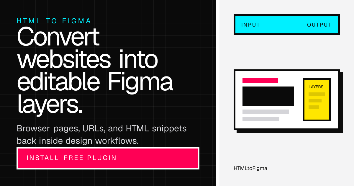 HTMLtoFigma converts any public webpage, URL, or raw HTML code into fully editable Figma layers — not flat screenshots, but real design structure you can select, edit, and rearrange.The problem is familiar to every design team: you need a website in Figma for a redesign, a QA comparison, a competitive teardown, or an inspiration reference — but the only option is to screenshot it or rebuild it block by block. HTMLtoFigma eliminates that manual work entirely.Three input modes cover every workflow:The conversion preserves what matters: typography, spacing, fills, borders, and layout hierarchy. Every element becomes a selectable Figma layer. Text is editable. Colors are inspectable. Layout is adjustable.Common use cases: design QA and handoff, competitive analysis, website redesigns, and building editable inspiration libraries.HTMLtoFigma is completely free during early access. No credit card required, no usage limits, no account creation. Install the Figma plugin, paste a URL, and get editable layers in under 30 seconds.