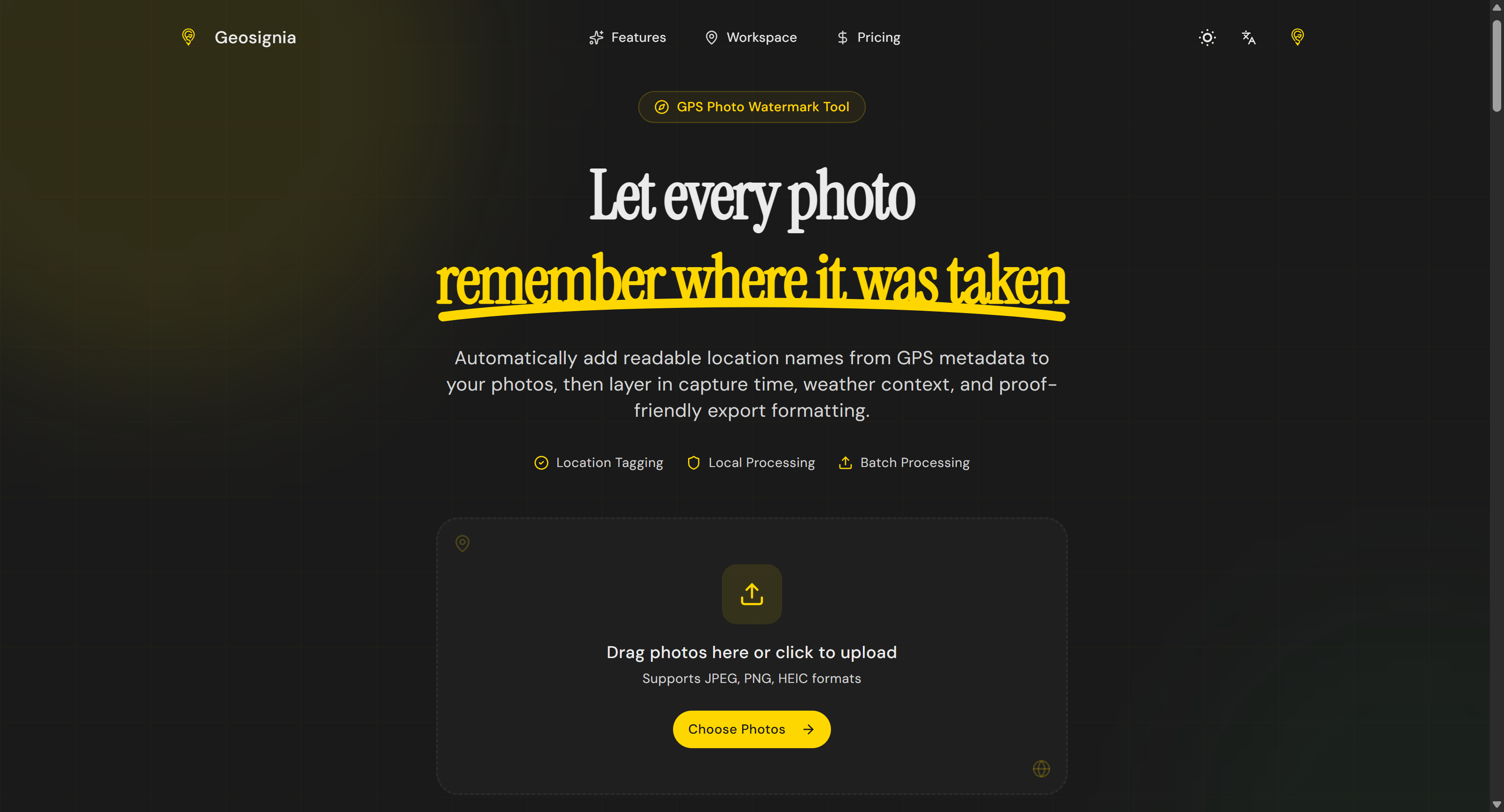 Add GPS location watermarks to photos instantly. Privacy-first: photos processed locally in your browser, never uploaded to any server. Batch processing supported.