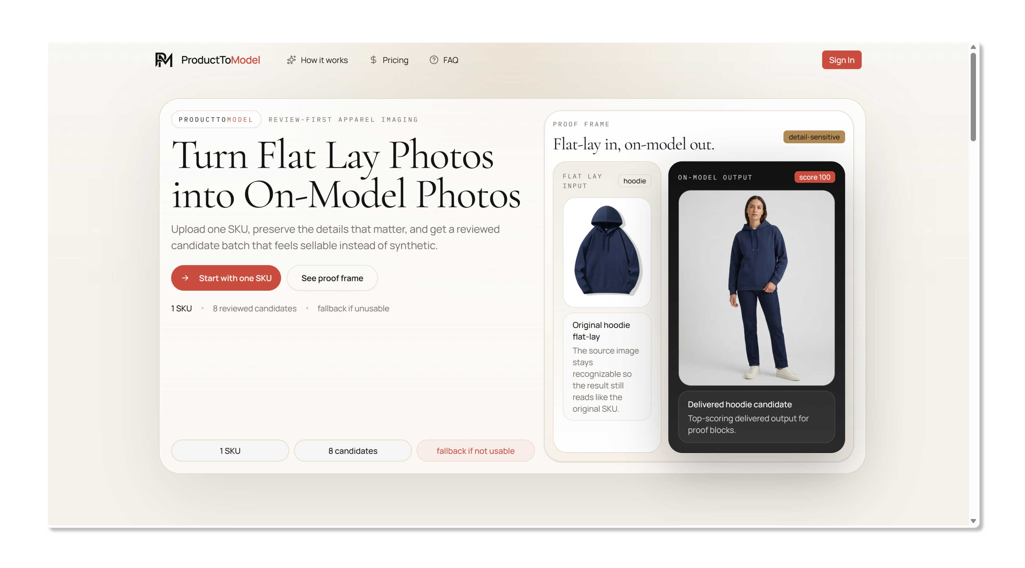 Product To Model helps clothing brands turn flat lay apparel photos into realistic on-model images that preserve garment details for PDPs, ads, and launches.